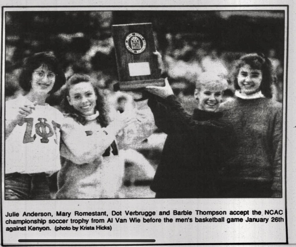 At Woo, corded phones were positioned next to radios playing 104.5 WQKT so that fans could catch the College of Wooster basketball game if they were out of the Canton, Ohio based listening area. One player’s dad called in “long distance” to every game he could not make, and the phone receiver was set up on the announcer’s table. At the time I thought that was so much money! There I go sounding old again. *Below is a picture of my teammates and friends being lauded at half time of a men’s (ranked 9th in the nation that year!) basketball game as proof that we were indeed once young and fun ;). Photo Credit: The Voice